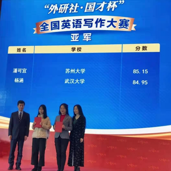 学子在外语学院大学英语部竞赛指导团队的带领下,取得了优异成绩。我校经济与管理学院2019级学生杨涵同学在祝捷老师及团队指导下获得写作大赛全国亚军和学术英语演讲专项赛二等奖,信息管理学院2019级学生刘皓琰和外语学院2018级学生李季冉在张红梅老师及团队指导下获得演讲大赛二等奖。
