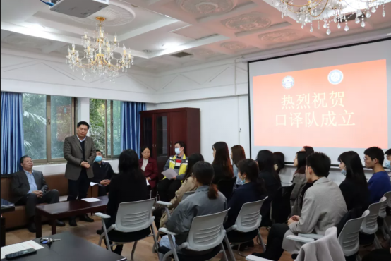 吴钟明老师作为新一届口译队总教练,讲述了口译队的历史传承与发展思路。口译队过去的辉煌,离不开学校、学院领导和老师们的支持。他表示将全力支持罗菁老师的工作,并把积累的经验、资料、资源投入到口译队的建设之中,把口译队推向新的高度。