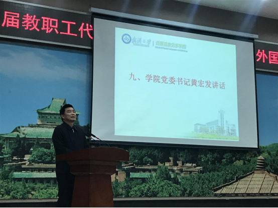 工会副主席陈蓓、组织与民主管理部副部长汪海英应邀出席,外语学院全体教代会代表参会。大会由学院党委副书记、工会主席胡浩主持。