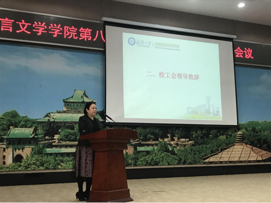 在庄严的国歌声中,会议拉开了序幕。校工会副主席陈蓓首先向大会致辞,她代表校工会对学院教代会的召开表示热烈的祝贺。她指出,学院教代会的召开给代表们提供了参与学院民主协商、民主管理、民主监督的宝贵机会,也是代表们履行权利和义务的有效途径。其次,陈蓓副主席代表校工会对外语学院在二级教代会标准化建设中取得的成绩表示肯定,对其中创新的工作思路和方法提出了表扬。最后,她希望学院工会能够继续立足本职,为学校和学院“双一流”建设做出更大的贡献。