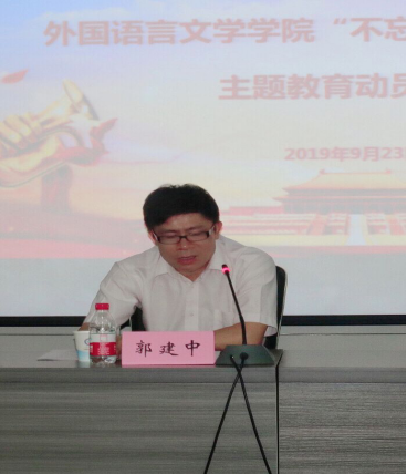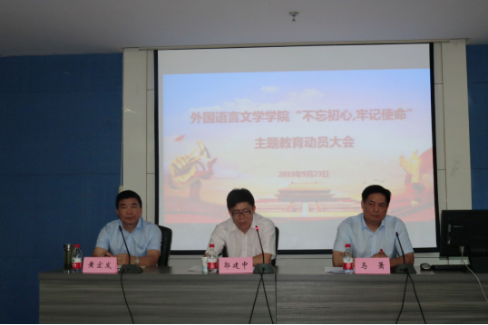 “不忘初心、牢记使命”主题教育动员大会在学院3005会议室顺利召开。学校主题教育第七巡回指导组组长、党委统战部部长郭建中出席会议并讲话,巡回指导组其他同志到会指导。学院领导班子成员及党委委员,党支部书记和支委(教职工和学生),系部正、副主任和内设办公室正、副主任,辅导员等出席动员大会。会议由外语学院院长马萧主持。