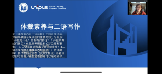 邓鹂鸣教授应外研社U讲堂特邀,于2021年8月31日作了题为“体裁素养与二语写作”云端专题公益学术报告,近2000名全国各地高校外语教师、硕、博士学生在线参听,报告受到邀请方及参听的一线外语教师、硕、博学生的积极好评。外研社U讲堂为开放、互动、发展的教师专业发展的在线平台,旨在构建辐射全国高校外语教师和发展在线共同体,助力广大外语教师学术交流、启迪思路、实现共同体成员互助协同、整体发展,近年由外研社U讲堂推出的系列公益学术讲座在全国外语界反响热烈,大力促进了外语教师专业发展。