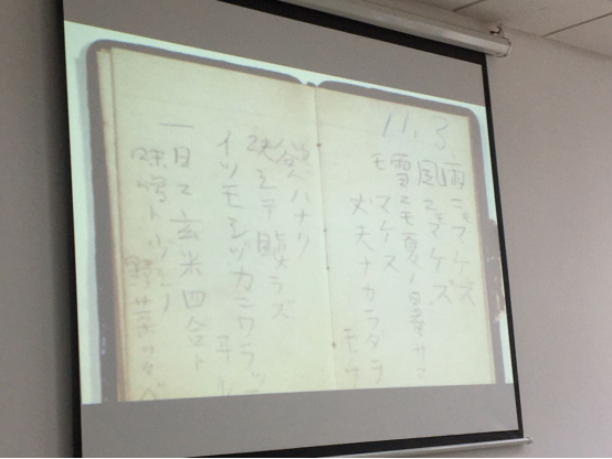 第二场讲座由周异夫教授主讲,讲座主题为“宫泽贤治:诗中的理想”,主要围绕宫泽贤治所创作的散文诗歌《不惧风雨》,结合作家经历,讲述了宫泽贤治蕴藏在诗中的理想。周教授首先向参与讲座的日文系老师和同学们展示了宫泽贤治个人肖像照,从珍贵的老照片出发,通过提问在座老师和同学对照片的印象和感受,带领同学和老师走进作家宫泽贤治的生活。其次,周教授介绍了宫泽贤治的诗人创作生涯,现今宫泽贤治的作品广受日本国内及海外读者的喜爱,也被众多学者研究,但宫泽贤治生前并未引起文学界关注。周异夫教授通过介绍香港311晚会中的开场曲《不要输给心痛》改编自《不惧风雨》等事例,向大家展示了现今宫泽贤治及其作品的知名度。