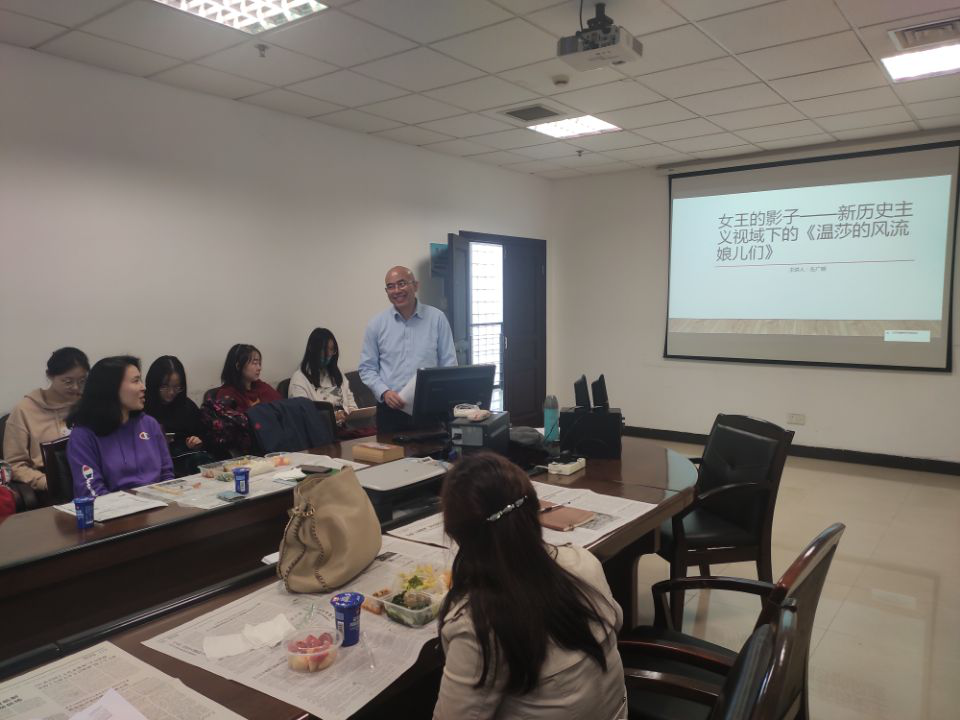 2021年4月15日,外语学院3055会议室举行了一场颇具人文风味的学术午餐会。在轻松、和谐的聊天式氛围中,左广明老师进行了以“女王的影子——新历史主义视域下的《温莎的风流娘儿们》”为主题的分享。主持人戴丹妮老师首先介绍了《温》剧的高观赏性和受欢迎度,左老师也强调了自己在核心通识课教学、伊丽莎白一世自传,乃至英国生活经历中获取的灵感。