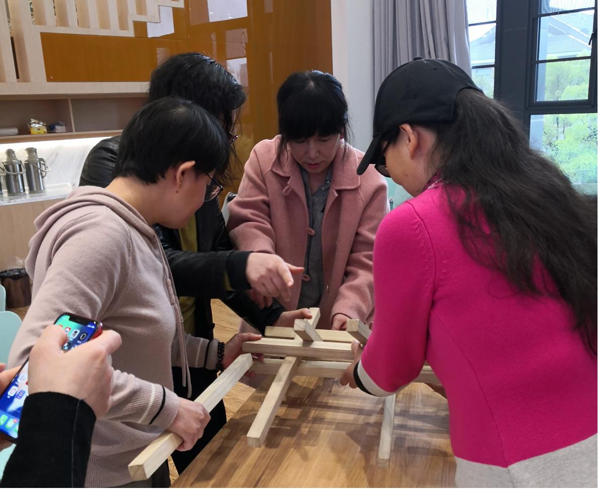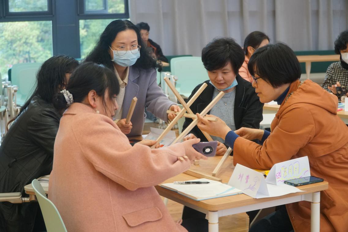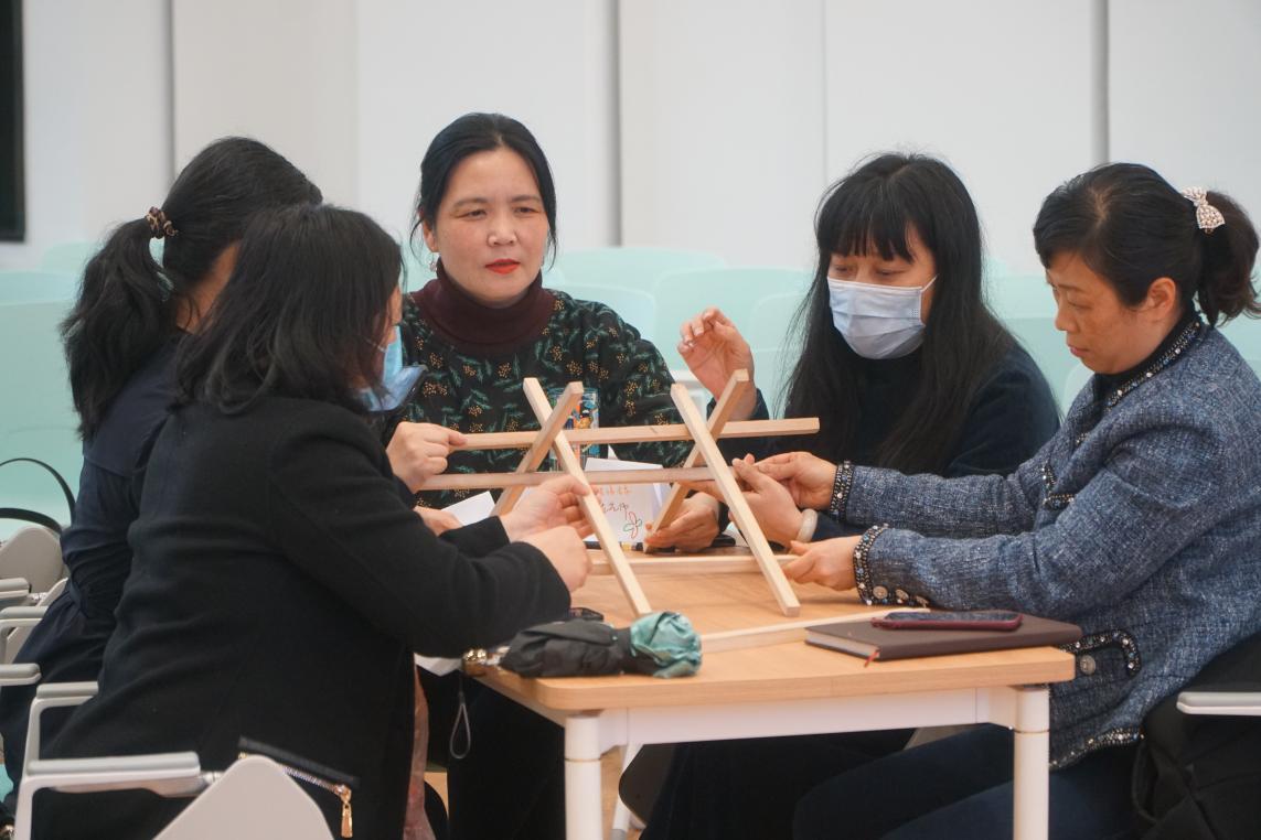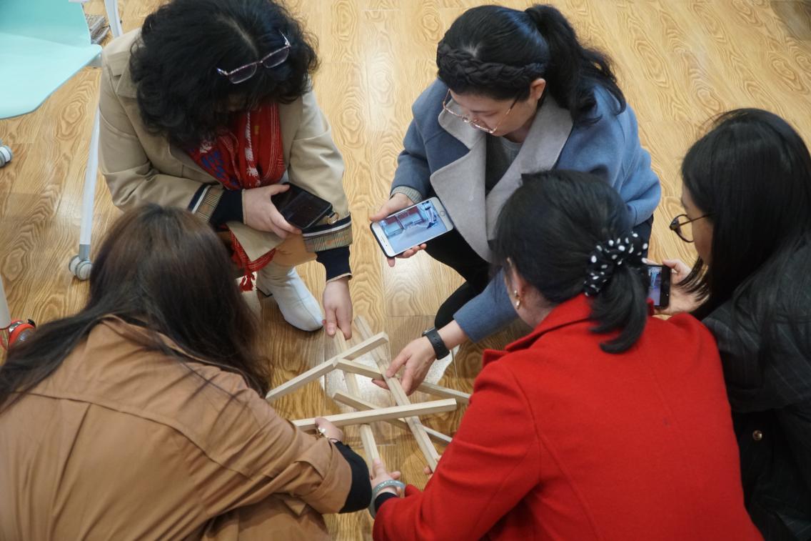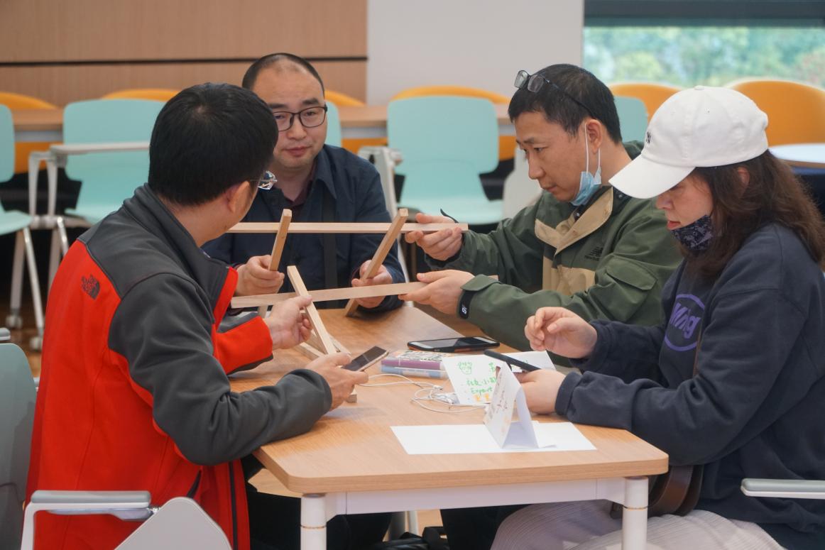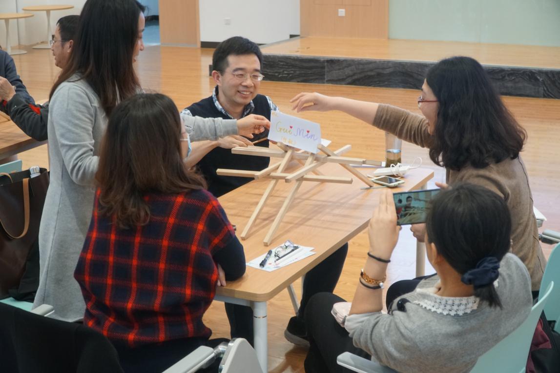 万臻老师依托自身教学经验,结合大学英语部教学特点,在前期问卷调查的基础上对工作坊的流程进行了设计。工作坊从小组内相互介绍开始,通过两两合作制作名片吸引老师们的注意力,随后的暖场活动“建大桥”更是让老师们兴趣倍增。有的组一边看指导视频一边细心操作,一次搭桥成功;有的组则反复实践终获牢固大桥,还有的组为了更好的效果,在地板上搭建大桥。