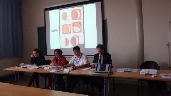 国家文化发展研究院院长傅才武教授共同主持。巴黎七大教授、法国国家科学研究中心(CNRS)宇宙学专家Marc Lachièze-Rey首先发言,他的题目是“月亮,从浪漫主义到幻想破灭”,1610年伽利略在《星际信使》中记录了用望远镜观测到的月球景象,月球旅行遂成为欧洲流行的文学主题,成为浪漫主义的象征,而后科学技术的进步虽然使月球旅行成为现实,对月球真实面貌的了解却大大减少了月球之于人类想象的魅力。来自巴黎索邦大学的Patrick Dandrey教授主要研究17世纪的法国文学,他探讨了法国作家西哈诺最令人印象深刻的两部作品:《月亮世界的故事》和《太阳世界的故事》,作家以天马行空的想象虚构出月球和太阳的惊奇旅行,建立了一个反观和批评现实世界的视角。19世纪法国文学专家Jean Delabroy教授认为,凡尔纳的两部“月球”小说——《从地球到月亮》(1865)和《环绕月球》(1869),相辅相成,书写了现代启示录。东亚语言文化学院中文系主任张香筠女士从翻译理论出发,介绍了凡尔纳小说De la Terre à la lune(鲁迅译为《月界旅行》)经由日本翻译到中国的历程。Sylvain Chaty教授完全从天体物理学出发,阐述了美国、欧洲、中国、印度、日本、以色列等国家地区基于科学需求或现实利益,重拾对月球的关注,建立“月球村”的远景规划。武大文学院张箭飞教授以中国民间传说、古典诗歌和周边材料为基础,概括出月球的三重中国想象,即神话、文学和科幻。法语系杜青钢教授对汉字“月”及法文的lune进行了字形上的比较研究,并与孔子学院书法老师胡嘉兴现场演绎了“月”的字体发展史。