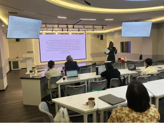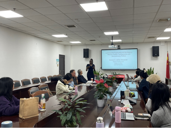 10月24日下午,亚历山大教授作了题为“经典的重塑与重构:玛丽斯·孔戴的越界性与革命性政治”(Canonical Re/Fashioning and Re/Making: Maryse Condé’s Transgressive and Revolutionary Politics)的首次讲座。她以2018年诺贝尔新学院文学奖获得者玛丽斯·孔戴的作品为研究对象,从女性主义和后殖民的双重视角深入分析了孔戴的多部作品,特别是《食人女人的故事》和《提图巴》。亚历山大教授指出,作为杰出的小说家和评论家,孔戴不仅展现了卓越的创作才华,还通过作品彰显了鲜明的性别意识和集体责任感。她强调,孔戴的作品具有明显的越界性与革命性,通过“迁移的文字”和“主体的迁移”等叙事策略,深刻重塑了文学史上的经典。