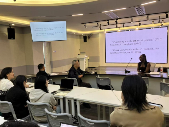 11月7日,亚历山大教授在题为“隐晦性、‘庸俗性’与他者/智慧的‘诉说渴望’:重审/重构加勒比文学与文化”(Obscurity, “Vulgarity” and ‘The Hunger to Tell’ Other/Wise: Re/Envisioning Caribbean)的第二场讲座中,探讨了加勒比裔女作家米歇尔·克利夫(Michelle Cliff)和海地裔女作家埃德温奇·丹蒂卡特(Edwidge Danticat)对传统文化的重新审视。她指出,克利夫和丹蒂卡特致力于提炼“文化、传统和与生俱来的权利”,并重新绘制“边缘”与“中心”的界限。这种重新定位挑战了传统的阅读和思考方式,促使人们重新想象英语加勒比文学及非洲加勒比文化。通过将克利夫和丹蒂卡特置于讨论中心,讲座激发了关于英语性、加勒比性以及英语加勒比身份的持续对话,重点探讨了正典化的局限性、归属感、公民身份以及黑人身体性与主体性的问题。