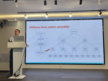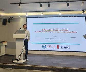 讲座伊始,闫逊教授梳理了流利度作为语言测试核心概念的发展脉络,指出其不仅关乎语言产出的流畅性、语言加工效率,更与交际能力密切相关。他强调,非流利现象并非流利度的反面,而是在自然言语中普遍存在的语言行为,具有重要的认知指示价值。接下来,闫教授结合来自大规模标准化语言测试与地方性测试的语音数据,深入剖析非流利特征在解释语言能力方面的增量贡献。他指出,非流利事件往往呈现多种时间性特征的共现,而非彼此独立,且其不同的共现模式反映了说话者在维持言语流畅与对话连续性时所面临的不同认知负荷与调节策略。这一观点突破了传统对流利度的静态认知,为研究与评估口语能力提供了新的视角。闫教授进一步探讨了研究成果在语言评估领域的实际应用价值。对非流利模式的深入理解不仅有助于优化评分标准,还对改进自动化评测技术及解释口语应答中的非流利现象具有重要意义,为未来语言测试的设计与实施提供了实践导向。