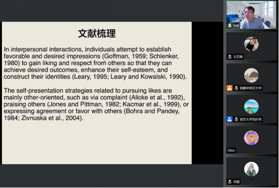 外语学院师生开展线上讲座,主题是“社交媒体自夸现象的语用研究”。该讲座由英文系刘庆荣老师主持,外语学院马萧院长、张妍岩副院长、程向莉副院长、邓鹂鸣教授和李丹丽老师等多名教师和研究生在线下与线上同步观看讲座,线上吸引了来自国内多所高校的300名听众参与交流。