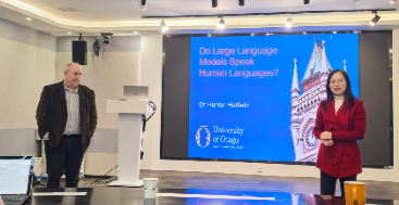 第一场讲座由张妍岩教授主持,聚焦“大语言模型与语言本质”。Hunter Hatfield博士深入探讨了生成式人工智能在语言生成、现实理解与交际能力方面与人类的根本差异,指出大型语言模型并未真正意义上“会说”人类语言,引导现场师生反思语言的本质属性。