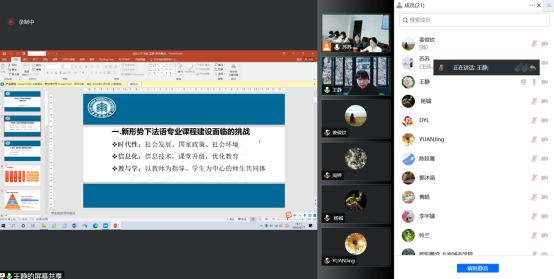 法语系师生开展了主题为“新形势下法语专业课程建设的挑战与应对”的讲座。本次活动由苏昉老师主持,法语系主任张亘老师、资深教师程平老师和程静老师、姜俊钦老师及多名研究生线上参会。此外,来自上海外国语大学、武汉理工大学、华中农业大学、武汉工程大学等高校的二十余位老师和同学在线上参与讲座。