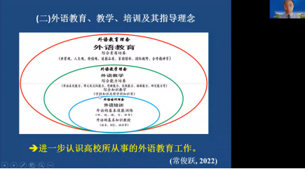 在讲座之后的提问环节,线上线下师生踊跃提问发言。程向莉副院长就大英部教学中的期末考评问题与常校长进行了探讨,张妍岩副院长针对英语及小语种专业本科生的课程设置及考评问题与常校长进行了切磋,常教授具体细致一一解答,并给出十分中肯的建议。常教授的讲座深刻阐释了培养怎样的外语人才、为谁培养外语人才以及如何培养外语人才等问题,为当前新外语背景下本校专业外语教学及大学英语教学改革提供了重要的启示和借鉴。讲座结束前,黄书记给与高度评价并作了精辟总结,指出常教授的外语教学理念实现了三个统一,即理论与实践统一、内容与形式的统一、过程与结果的统一。讲座最后,黄书记感谢常校长百忙之中为外院师生带来这场内容深刻且极具启发性的学术报告。本次讲座圆满落下帷幕。