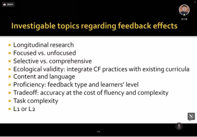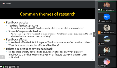 在问答环节,李少峰教授就与会者提出的纠正性反馈与沟通意愿、英语写作教程编写、书面反馈的学生投入度等问题进行了一一解答。在本次讲座中,李老师详细介绍了纠正性反馈的理论基础,分享了经典和前沿的研究成果,指出了未来可供研究的发展方向,内容丰富,讲解清晰,令广大参会者受益匪浅。