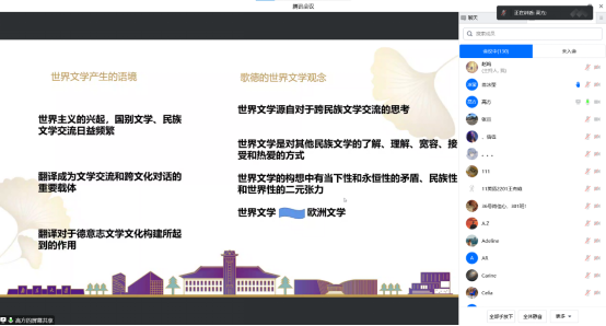 在交流互动环节,高方教授就与会师生提出的世界文学的研究本质、翻译的文化差异性等疑惑逐一进行了解答。同时,作为在翻译学及比较文学两领域积累有丰厚研究经验的资深学者,高方教授还指出,世界文学是从翻译中获益的文学,文学从翻译中获得交流,在超越了民族范畴的更广阔范围内彰显其价值。对未来有志于从事比较文学及世界文学研究的青年学子们来说,掌握多门外语、累积翻译经验都是极为重要的入门技能。