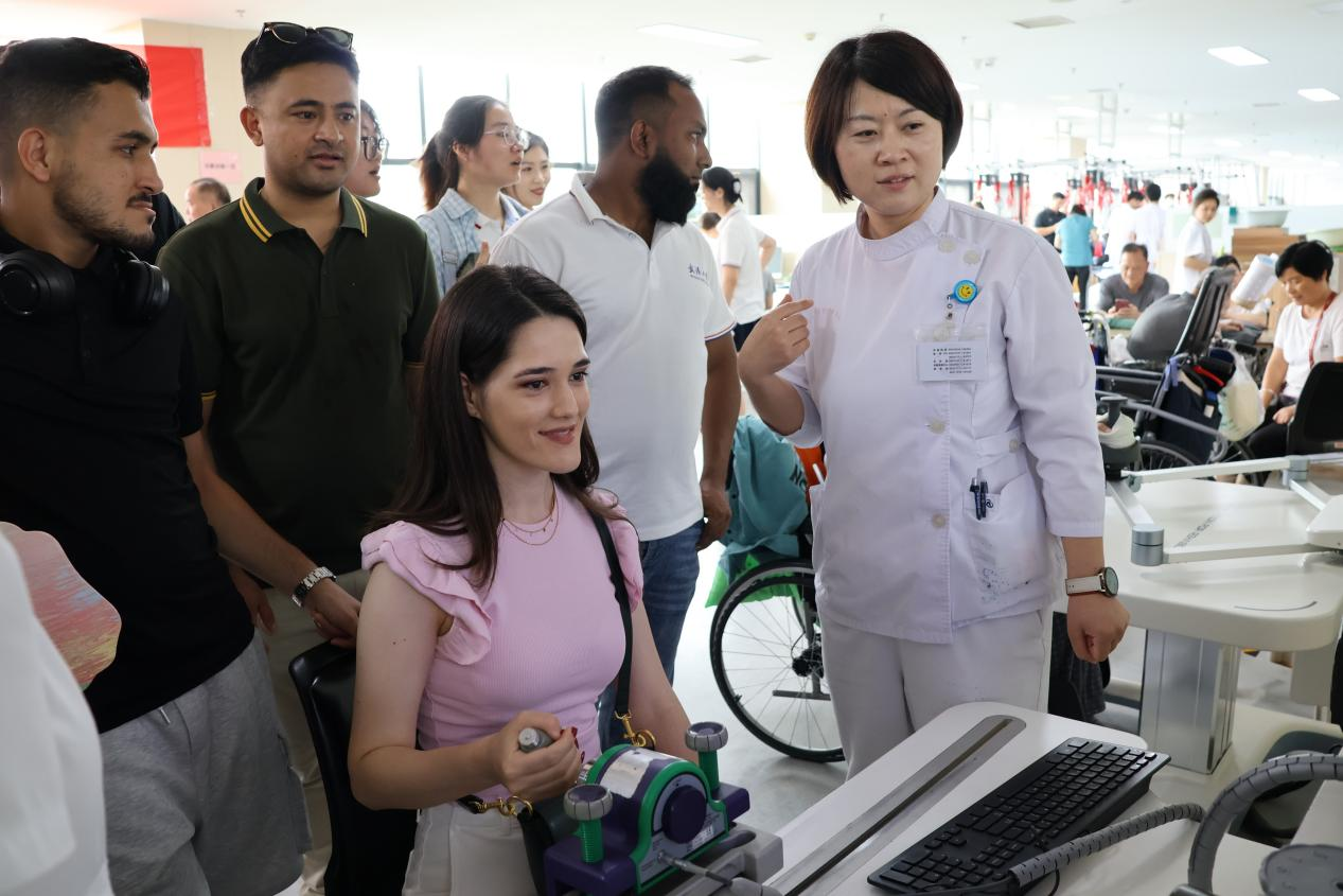 实践队还参访了河南中医药大学第四附属医院,了解应用中的中医康复疗法。在康复大厅,同学们见到了正在康复中的患者进行吞咽康复、语言康复等,亲身体验了以电子游戏形式锻炼手眼协同的康复机器。在针灸与治疗区,医学专业留学生与国家级中医按摩技能大师曲迎彬以及现场的针灸医师进行热烈交谈,并观摩针灸、艾灸治疗过程,在此过程中感受中西医的区别与交融,也深刻体会到产学研融合对中医药创新发展的推动作用。