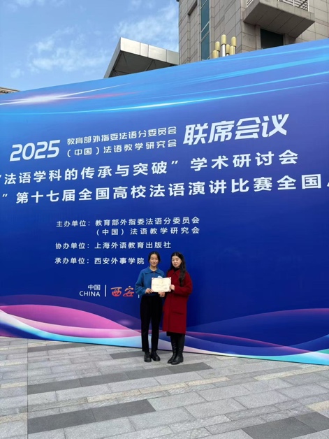 这份沉甸甸的荣誉背后,是参赛学生的不懈努力和老师们的辛苦付出。在苏昉和姜俊钦两位老师的精心指导下,张瑞同学从主题解读、稿件打磨到演讲技巧、仪态管理,进行反复演练和持续优化,最终闯入总决赛。她的出色表现充分彰显了法语学子扎实的专业素养、卓越的综合能力和积极向上的精神风貌。